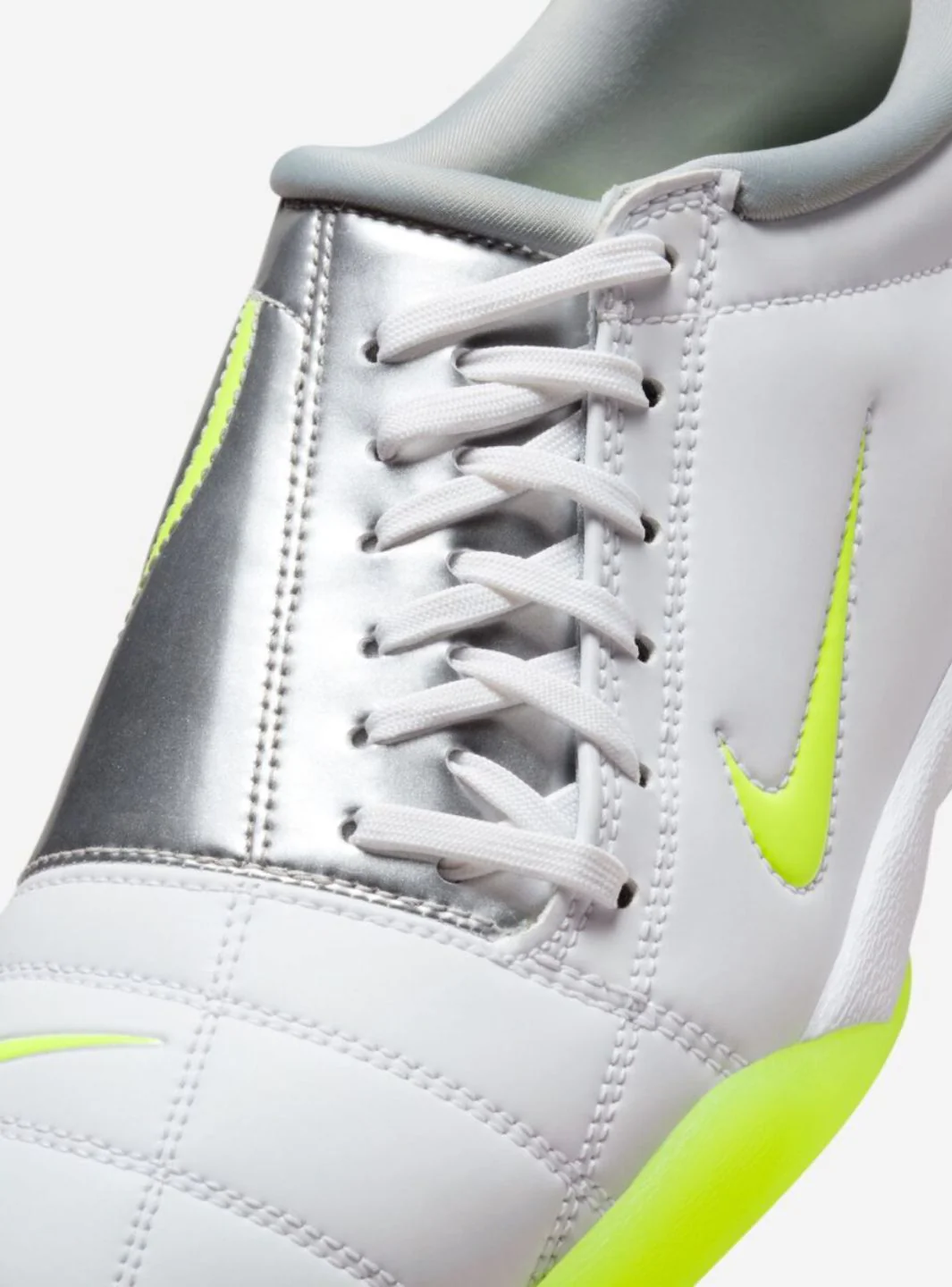 Totalmente rielaborata, la nuova Nike Total 90 3 x Palace White Silver Volt si presenta in una palette composta da White, Metallic Silver e Volt, richiamando le versioni indossate da leggende del calcio come Wayne Rooney. La tomaia in pelle bianca liscia, impreziosita da cuciture trapuntate sulla punta, si contrasta elegantemente con il pannello mediale cromato, conferendo alla silhouette un’estetica futuristica con un forte richiamo retrò. Gli accenti Volt distribuiti tra outsole, Swoosh e branding sul tallone aggiungono l’inconfondibile energia del Nike Football reinterpretata da Palace.